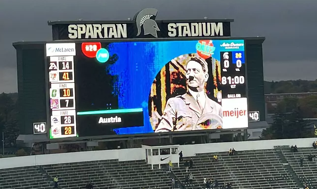בהפסקת המשחק מול מכללת מישיגן, שבו הקבוצה הביתית ספגה תבוסה של 49:0, נערך חידון להנאת הצופים, אך משום מה זה נראה לגיטימי למארגניו לעלות את השאלה "היכן נולד אדולף היטלר" ולהקרין על לוח התוצאות את התמונה של הצורר הנאצי.