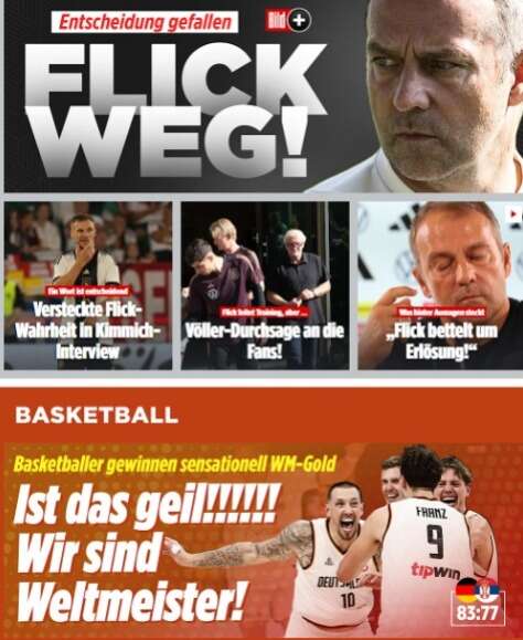 גרמניה חצויה: ביום בו נבחרת הכדורסל זוכה לראשונה בהיסטוריה באליפות העולם, בנבחרת הכדורגל נפרדו מהמאמן הלאומי האנזי פליק, שפוטר אחרי ההפסד אמש (שבת) ליפן.
