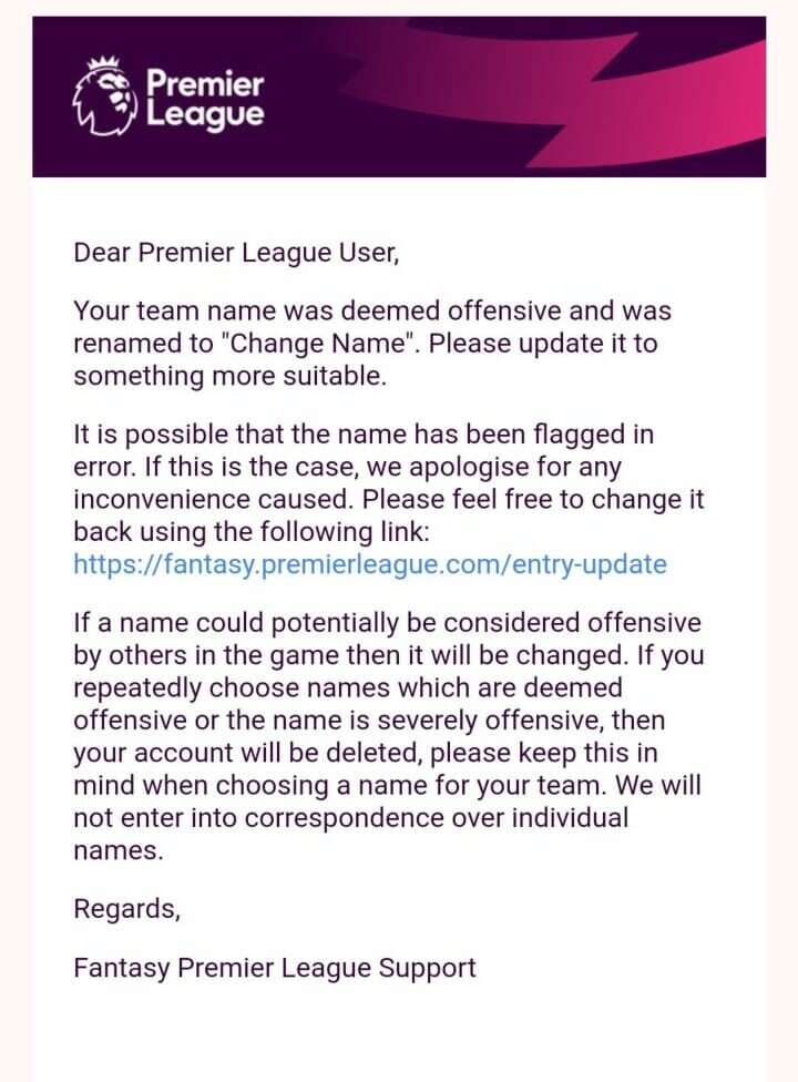 בהודעה של הפרמייר ליג למשתמש שבחר לכתוב ישראל נכתב בין היתר: "שם הקבוצה שלך פוגעני ולכן עליך לשנות שם, אנא עדכן אותו למשהו יותר מתאים. אם השם שלך עלול להיחשב כפוגעני על ידי משתמשים אחרים, אז הוא ישתנה, ואם אתה תחזור להשתמש בשמות פוגעניים אז המשתמש שלך יימחק".