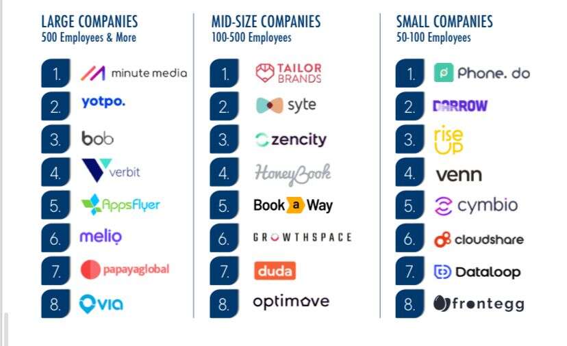 את קטגוריית החברות הקטנות שמעסיקות 50-100 עובדים מובילה Phone.do ואחריה Darrow, רייזאפ, Dataloop, Cloudshare, Cymbio, Frontegg, ו-Venn.
