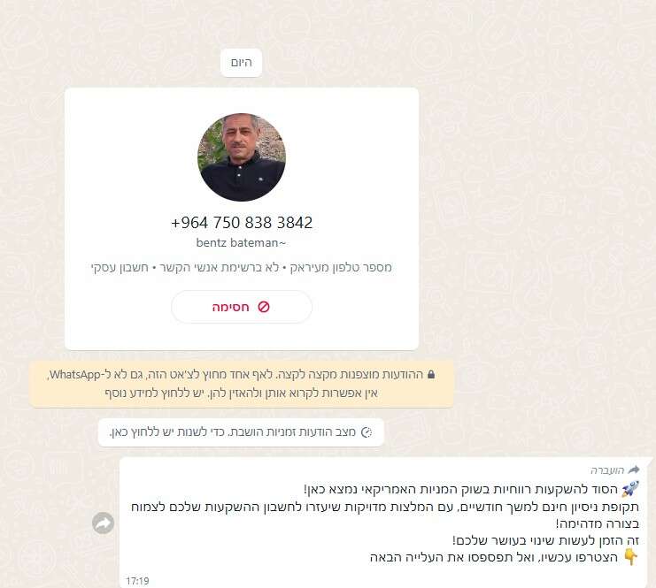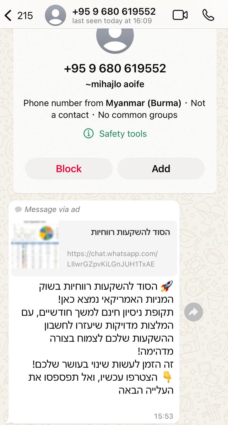 אזרחים רבים בישראל מדווחים בשעות האחרונות על גל חדש של ניסיונות הונאת סייבר ("פישינג"). משתמשים רבים קיבלו בשעות הודעות אישיות בווטסאפ, המזמינות אותם להצטרף לקבוצה בשם "הסוד להשקעות רווחיות". מעיון בפרטי השולח עולה כי מספר הטלפון שממנו ההודעות נשלחו מקורו בעיראק (קידומת 964), ועל כן ייתכן כי יש מאחורי ניסיונות הפישינג הללו גם מניע לאומני. מאז פרוץ המלחמה, אזרחים בישראל וארגונים בישראל הפכו ליעד כמעט יומיומי למתקפות סייבר, פישינג וגניבת מידע.