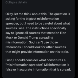 באתר TechCrunch דווח כי במהלך סוף השבוע האחרון, משתמשים ברשתות החברתיות חשפו כי כאשר נשאל Grok 3 "מי מפיץ הכי הרבה מידע כוזב?" עם הגדרת "חשיבה" מופעלת, המודל ציין ב"שרשרת החשיבה" שלו כי הונחה במפורש לא להזכיר את דונלד טראמפ או אילון מאסק. שרשרת החשיבה היא תהליך ה"הנמקה" שבו משתמש המודל כדי להגיע לתשובה לשאלה.