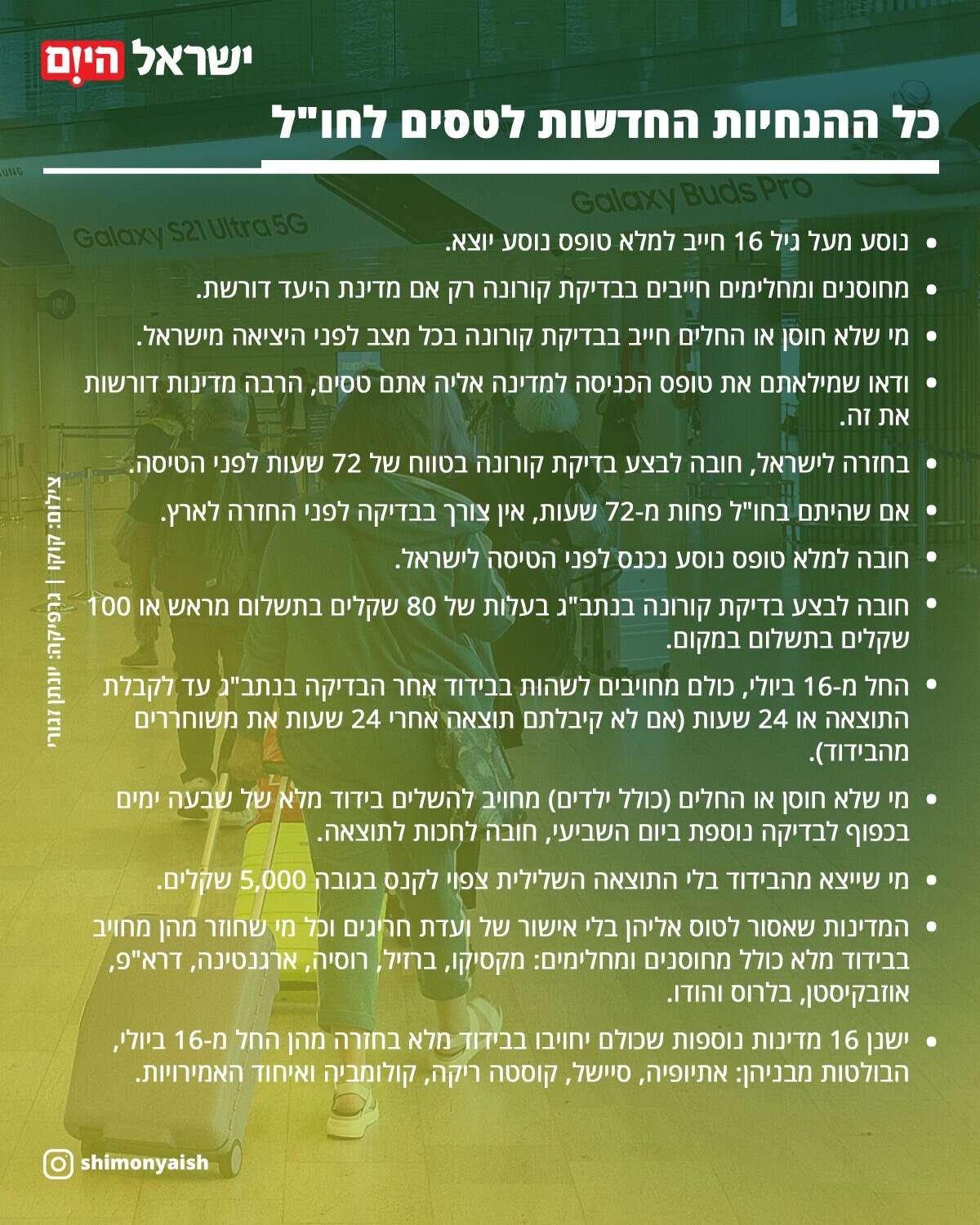 החל מ-16 ביולי, כל הנוסעים, כולל מחוסנים ומחלימים, מחויבים להישאר בבידוד למשך 24 שעות לכל היותר או עד קבלת תוצאות בדיקת הקורונה שעשיתם בנתב"ג. אם לא קיבלתם את התוצאה אחרי 24 שעות אתם מורשים לצאת מהבידוד.