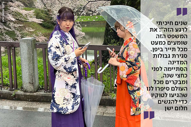 "שנים שחיכיתי לרגע הזה" - זה המשפט הנפוץ ביותר ששמעתי מפי תיירים שהגיעו בימים האחרונים ליפן. עד לפני כמה ימים יפן התקשטה בוורוד ולבן, עצי הדובדבן פרחו, והעונה המבוקשת ביותר בקרב תיירים, זאת שמושכת אליה מיליונים מרחבי העולם, היתה בשיאה. מדובר בתקופה קצרה מאוד שנמשכת פחות משבועיים, שבמהלכה עצי הדובדבן משנים את צבעם לוורוד ולבן, מה שמרגיש כמו חלום. היפנים קוראים לזה "סאקורה", וגם הם עוצרים את העשייה כדי ליהנות מהיופי יוצא הדופן הזה. בתום הפריחה הקצרצרה העצים נותרים עירומים.