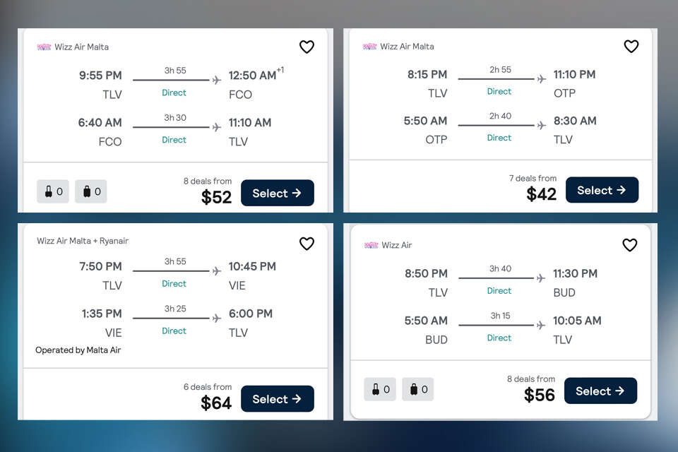 בבדיקות שביצענו, מצאנו גם טיסות לבוקרשט במחירים שמתחילים ב-42 דולרים (13-7בנובמבר), וגם כך לטיסות לקפריסין, בולגריה, יוון ויעדים נוספים.