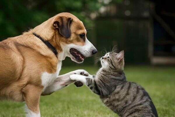 חתול וכלב משחקים יחד. צילום: מערכת feedy באמצעות הבינה המלאכותית ideogram