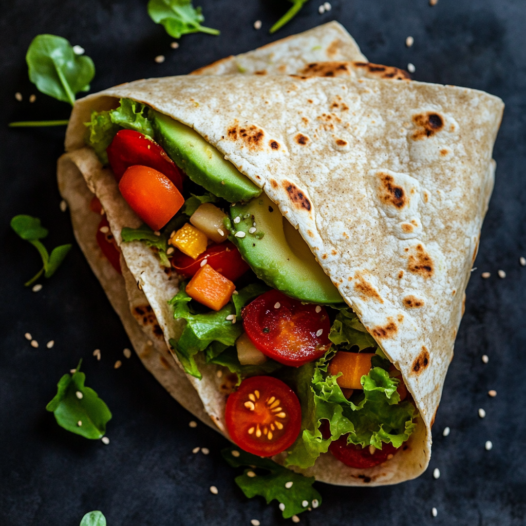 קמח מלא מכיל סיבים שמסייעים לשמירה על תחושת שובע, ואבוקדו הוא מקור מעולה לשומנים בריאים. שילוב הירקות מספק ויטמינים חיוניים ורעננות למנה.
