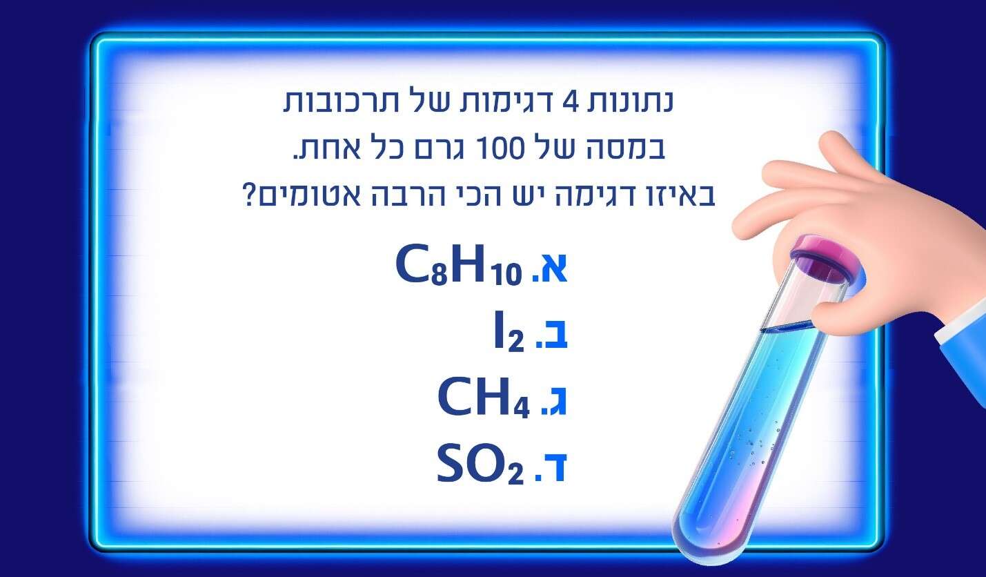 נתונות 4 דגימות של תרכובות, במסה של 100 גרם כל אחת. באיזו מהדגימות הבאות יש הכי הרבה אטומים?