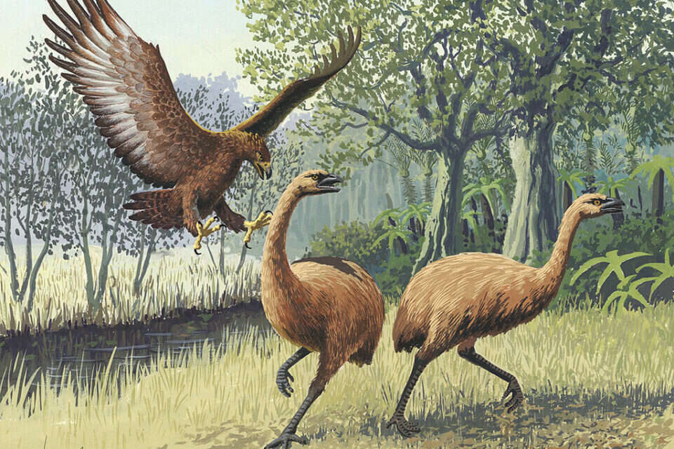 איור של העוף הענק מואה, שנכחד בניו זילנד, צילום: John Megahan, ויקיפדיה