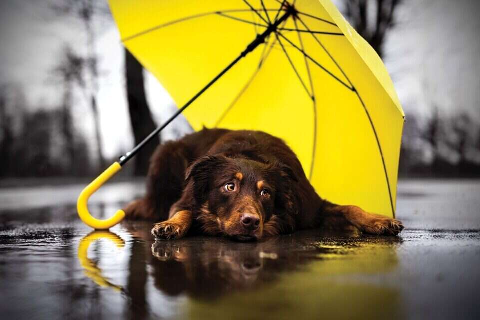 הימנעו מהליכה עם ציוד גשם שמפחיד את הכלב שלכם. אם הכלב שלכם מפחד ממטריות, נסו להימנע משימוש בהן עד אשר תרגילו אותו בצורה חיובית ומבוקרת למטרייה (התניית נגד – זוכרים?). כנ"ל לגבי כל דבר שאתם משתמשים בו בגשם (מעיל מרשרש, כובע צמר ענקי וכו').