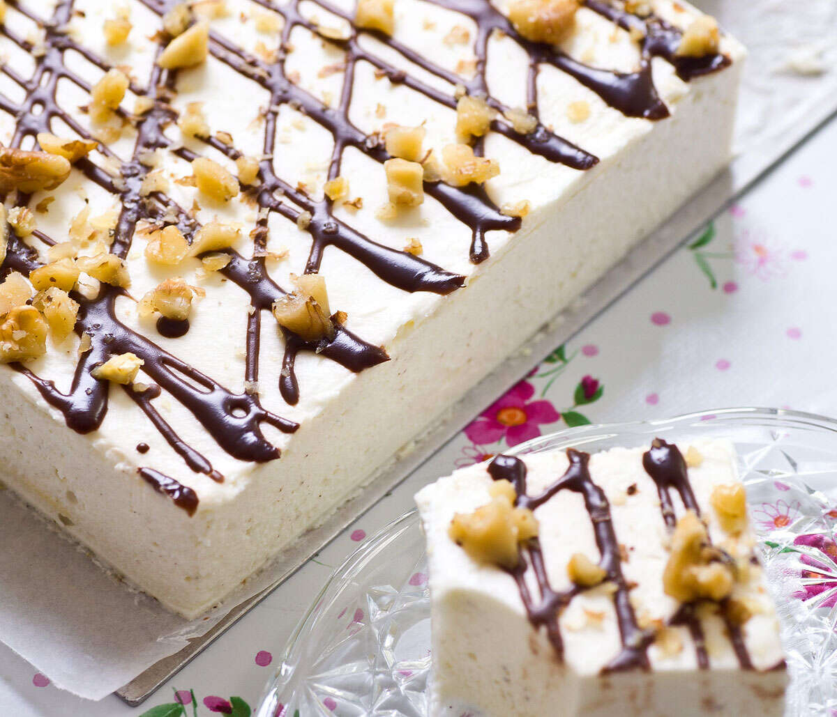 מרכיבים: מניחים בתחתית התבנית המלבנית רולדה לבנה. מוזגים לתבנית את הקרם ומכניסים למקרר לכארבע שעות. מקשטים בסירופ שוקולד ובאגוזים ומגישים.