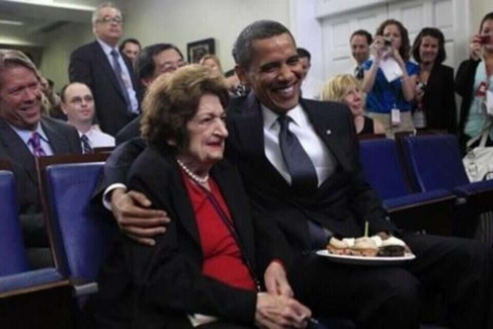צילום: Reuters // U.S. President Barack Obama puts his arm around White House columnist Helen Thomas after presenting her with cupcakes in honor of her birthday
