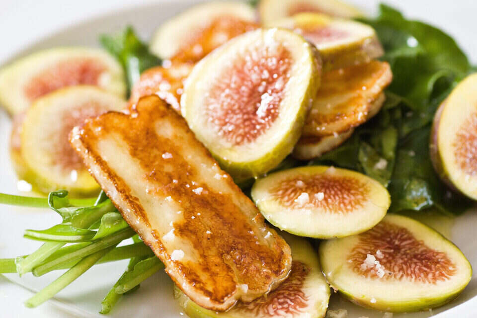 על צלחת רחבה מפזרים את עלי הרוקט, ומעל מניחים את התאנים הפרוסות. על מחבת יבשה, בחום גבוה, מזהיבים את החלומי משני הצדדים ומניחים מעל התאנים. זולפים מעל הכל שמן זית וכמה טיפות חומץ חרז וממליחים.