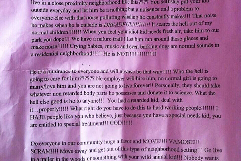 הפתק האנונימי נשלח בשישי האחרון לבית סבתו של מקס בגלי בן ה-13, והוא חתום על ידי מי שכינתה את עצמה "אמא עצבנית". המכתב מתייחס אל מקס כ"מטרד השכונתי", "מפגר" וכ"מקור לרעש נוראי". צילום של הכתוב פורסם בסוף השבוע האחרון בטוויטר על ידי חברי המשפחה, שראו לנכון לשתף את התוכן הנוראי הזה.