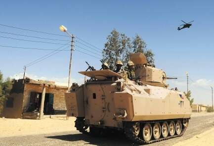 צילום: AP // Egyptian soldiers patrol in an armored vehicle backed by a helicopter gunship during a sweep through villages in Sheikh Zuweid in the northern Sinai [Archive]