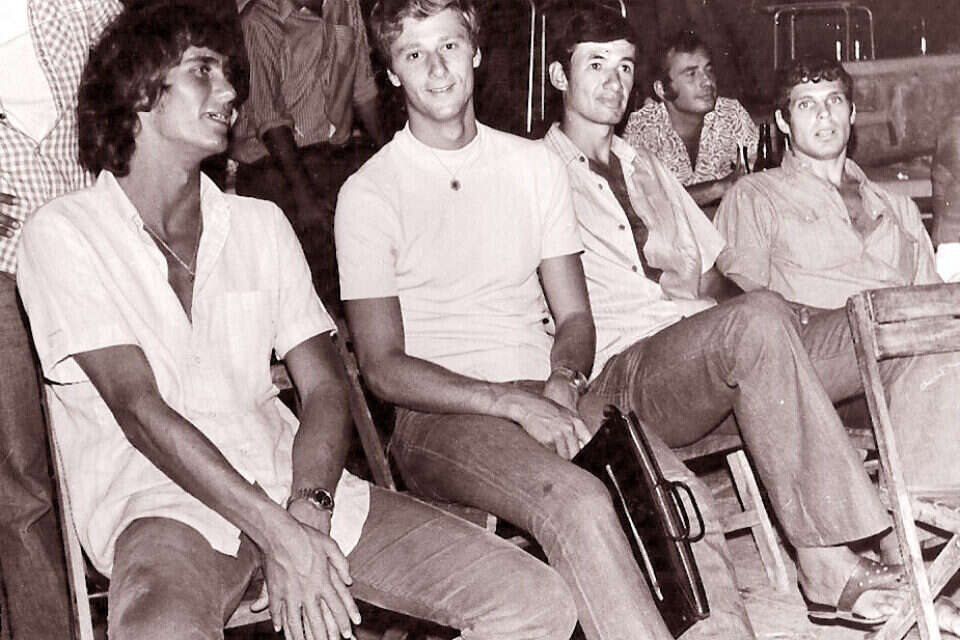 צילום: מאלבומו הפרטי של גור בן־דוד // "התחלנו לחשוב שלא יהיה לאן לחזור". משמאל לימין: שחקני הנבחרת חנן קרן, מיקי ברקוביץ', בועז ינאי וגור בן־דוד