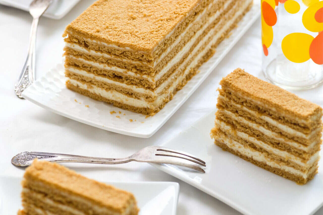 עוגת דובוש דבש, עם התאמה לחגי תשרי, העשויה שכבות בצק תופין, קרם וניל ופירורי חמאה פריכים. את עוגיות החמאה כדאי לפזר לפני ההגשה כדי שיישארו פריכים.