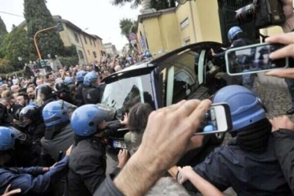 Riot police struggle to hold back crowd outside funeral of former German SS officer Erich Priebke, who died last week at age 100 • Priebke had been serving a life sentence under house arrest for his role in the killing of 335 civilians near Rome in 1944.