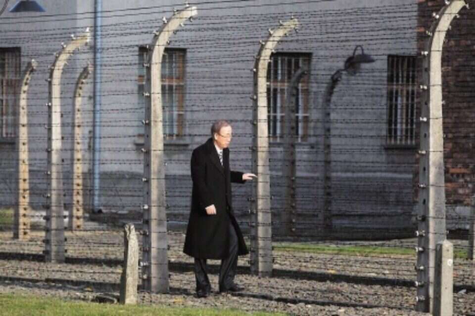 U.N. Secretary-General Ban Ki-moon on Monday visited the former Nazi death camp of Auschwitz to pay tribute to Holocaust victims. Ban walked through the infamous "Arbeit Macht Frei" ("Work Makes You Free") gate to see exhibitions documenting the inhumane conditions inmates suffered there. "I stare at the piles of glasses, hair, shoes, prayer shawls and dolls, and try to imagine the individual Jews and others to whom they belonged," Ban said. "I stand in disbelief before the gas chambers and crematorium, and shudder at the cruelty of those who designed this death factory." Ban laid flowers at the execution wall, where thousands of inmates, mostly Polish resistance members, were shot. He then went to nearby Brzezinka village, home of the former Birkenau death camp, with its crematorium ruins and a monument to the victims. "Auschwitz-Birkenau is not simply a register of atrocities. It is also a repository of courage and hope. Today I say loud and clear: Never again," Ban said. He also visited the Chevra Lomdei Mishnayot synagogue, the only remaining building that testifies to the pre-war vibrant Jewish life in the town of Oswiecim, from which Auschwitz took its name. In its guest book, Ban wrote that he was leaving "saddened but also with huge determination to build this world of equality, human dignity and peace," according to an image of the entry made available by the Jewish Center in the town. From 1940 to 1945, some 1.1 million people, mostly Jews, died in gas chambers or from starvation, disease and forced labor in Auschwitz and the adjacent Birkenau death camp that Nazi Germany built in occupied Poland. Ban also visited Krakow, 50 kilometers (31 miles) from the Auschwitz memorial. In 1995, Boutros Boutros-Ghali was the first U.N. secretary-general to visit Auschwitz.