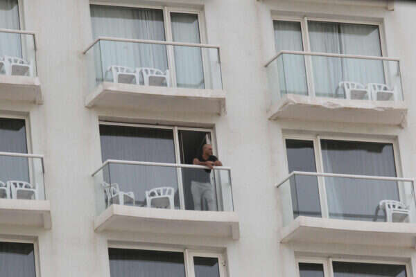 אייל גולן שוחרר ממעצר הבית. צילום: אלפרד בוכריס // גולן כפי שנצפה הבוקר במרפסת המלון בו שהה במעצר בית