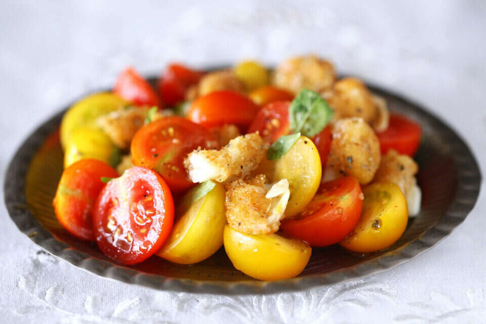 חושבת על מנות קלילות כדי לרענן את התחושה הסופגנייתית שאוחזת בי. חותכת עגבניות שרי יפות, צבעוניות וכל כך מגרות ומחליטה על קפרזה פשוטה. אלא שאת פרוסות המוצרלה אני בוחרת לטגן, ממש כמו שניצל. יוצקת מעל שמן זית ריחני, מטפטפת חומץ בלסמי כהה ומקשטת בתפרחת עלי בזיליקום.