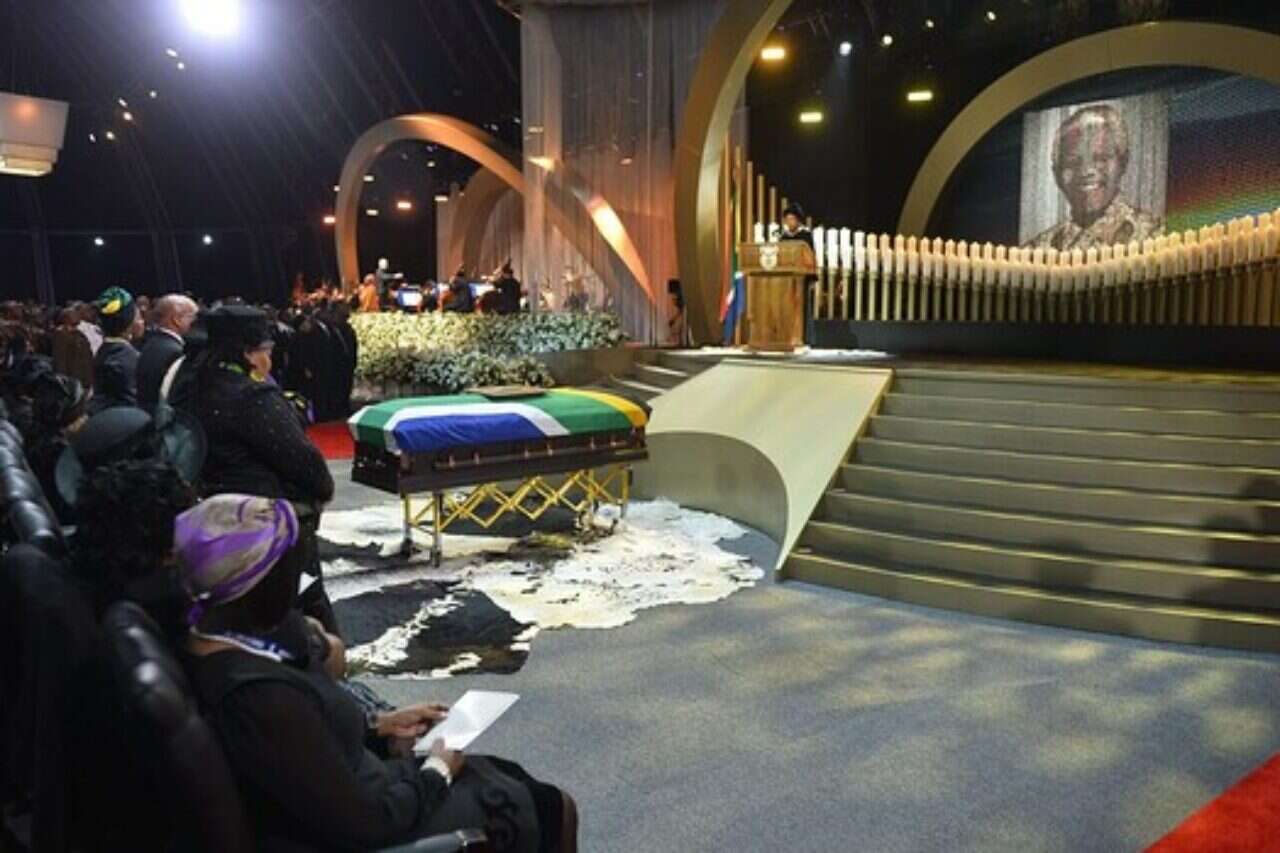 כשארונו של מנדלה, מכוסה בדגל דרום אפריקה, הובל על ידי רכב צבאי, סוללה של תותחים שמוקמו על צלע ההר ירתה מטח הצדעה, שהרעיד את העמק שטוף השמש. הארון הובל לתוך אוהל שחור שהוקם במקום על ידי נכדו של מנדלה, ונשיאה הנוכחי של המדינה – ג'ייקוב זומה. לאחר מכן, הונח הארון על מול סהר של 95 נרות, אחד לכל שנה מחייו של מנדלה, ולווה בשירת ההמנון הלאומי, שאומץ לאחר תום משטר האפרטהייד ב-1994.