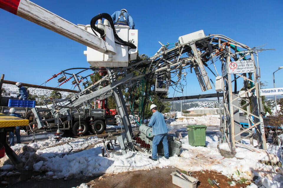 צילום: דרור ארצי // עובדי חברת חשמל מתקנים קו מתח גבוה, אתמול