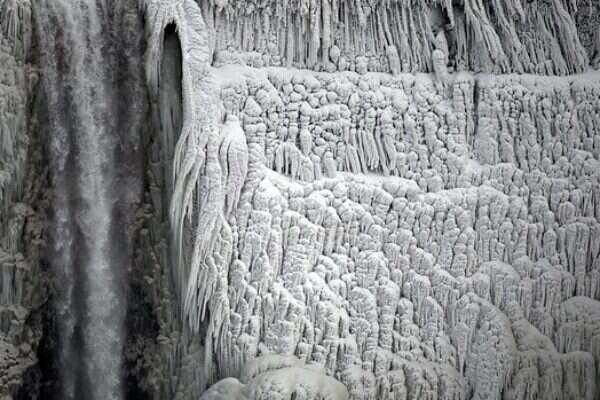 המים – או במקרה זה נטיפי הקרח – צוללים מגובה 50 מטרים, בשלושה מפלים רחבים ומרשימים החולשים על הגבול עם קנדה.