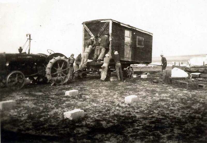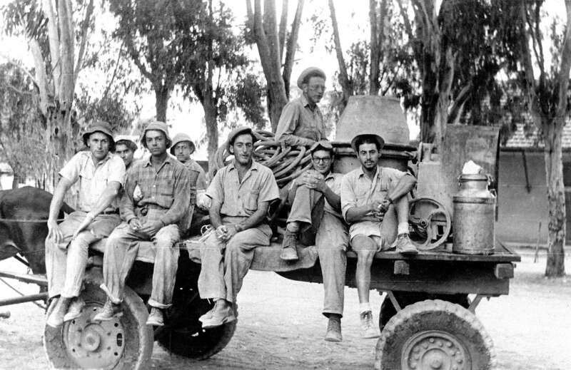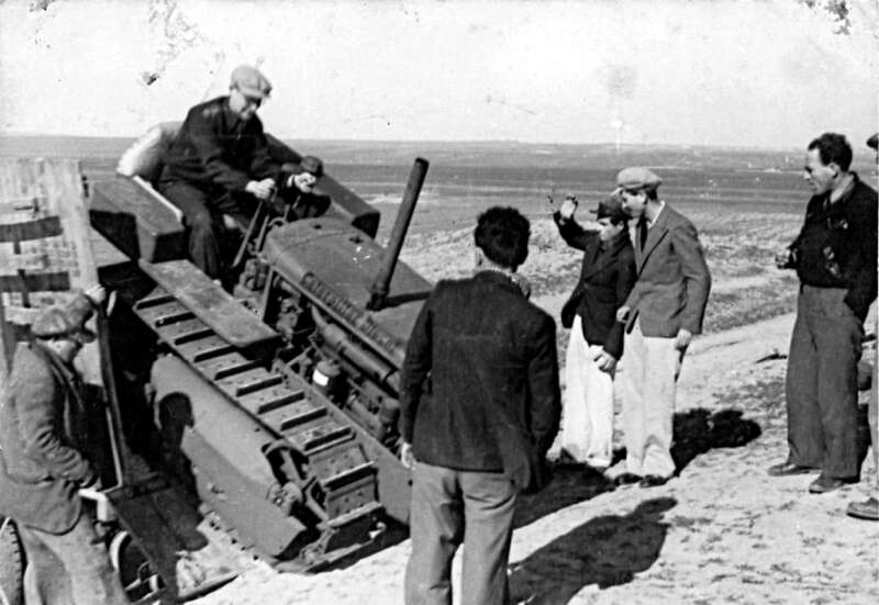 7. בחורף 1943 החלו לעבור לנקודת ההתיישבות בנגב. כיוון שבמשך שנות השהייה במחנה ליד פרדס חנה צמחו משפחות ונולדו ילדים, היה המעבר מדורג. בתחילה עברו חברים וכלים לבנייה והכשרת הקרקע. בתצלום: טרקטור נפרק ממשאית בנקודת ההתיישבות בארות יצחק בנגב, כ"ב שבט תש"ג.