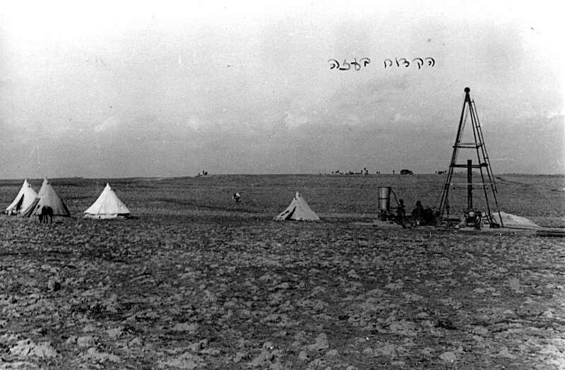 10. 1943 מגדל הקידוח של הבאר המלוחה (הקידוח הראשון). ברקע נראית העלייה לנקודה עצמה