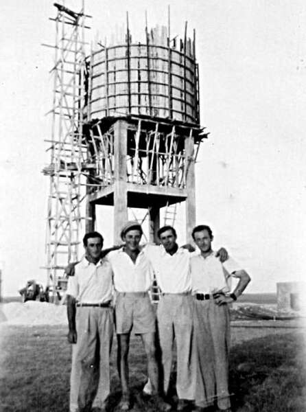 15. 1945 יציקת מגדל המים. הבחורים שייכים לקבוצת עולים חדשים שהגיעה לאחרונה