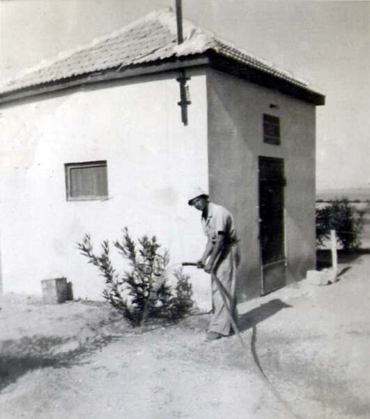17. 1947 גנן הנוי יצחק זקס (זכאי) משקה שיחים ליד ה"נוקטה" מחסן הנשק של הנוטרים