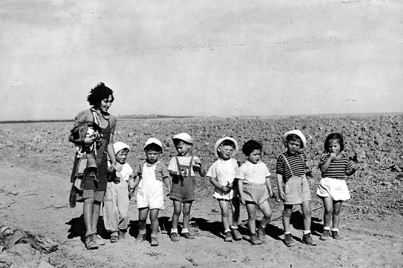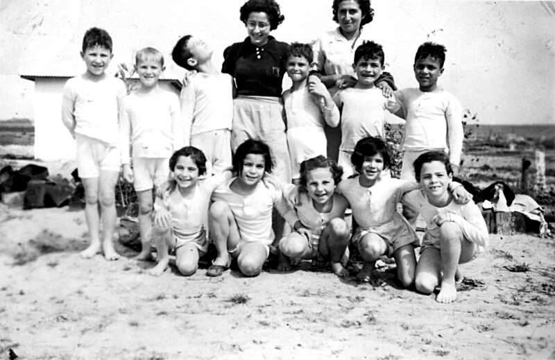 23. בשנת 1943 הגיעו לא"י ילדי טהרן שחולצו מאירופה. רבים מהם היו יתומים. מספר ילדים מקבוצה זו מצאו את ביתם החדש בבארות יצחק. בתצלום: ילדי הקיבוץ וילדי טהרן. המטפלות אורה אהרן וברוריה בורנפרוינד.