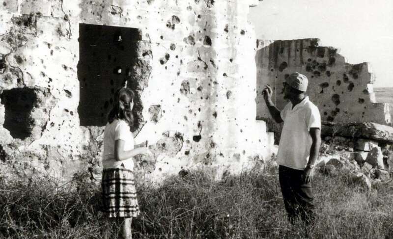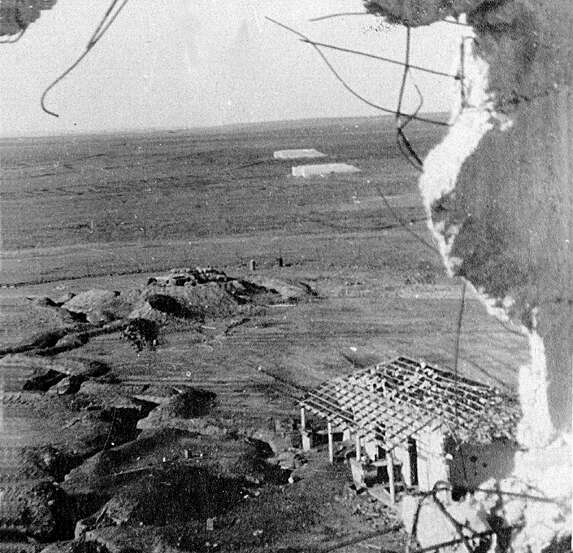 35. תצפית מערבה אחרי הקרב - מבעד פרצת הפצצה בקיר מגדל המים. עמדת "בית הלורדים"