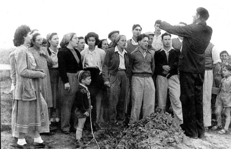 43. 1950 מקהלת הקבוצה בניצוח קראל סלמון (היה תושב המקום) בטקס הנחת אבן הפינה לבארות יצחק החדשה.