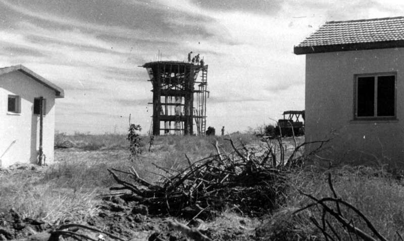 47. 1951 יציקת מגדל המים בבארות יצחק החדשה. נבנה בצלמו של המגדל בקיבוץ בנגב