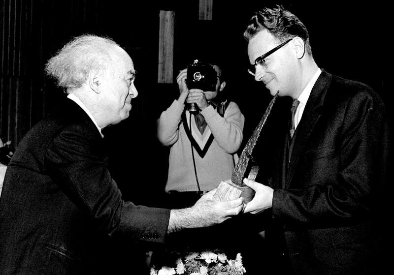קישון (מימין) מקבל את פרס כינור דוד מאברהם שלונסקי, 1964 צילום: לע"מ