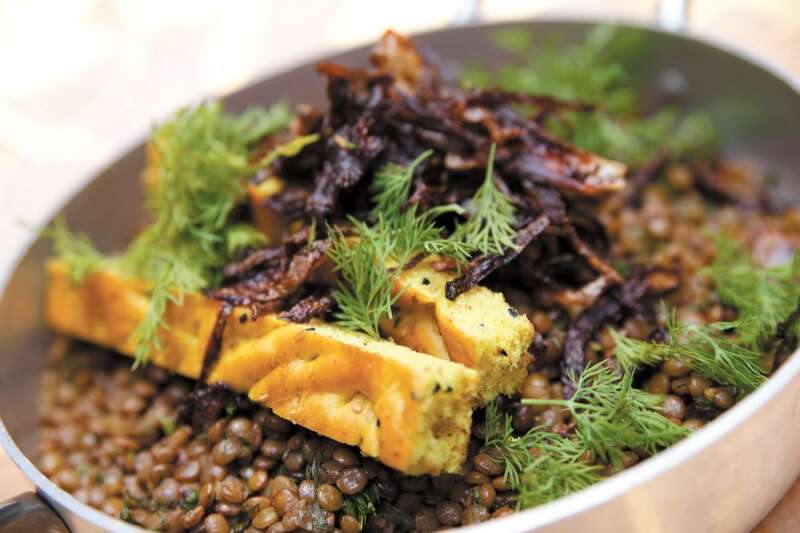 עדשים חומות לפתיחה ועדשים שחורות כסלט משגע, מצע לקובה צמחוני. מעטפת דקה ופריכה, שנולדה בין ידיים עם מיומנות גבוהה, ממולאת גרגירי חומוס וגבינת חלומי. איזה יופי של מנה.