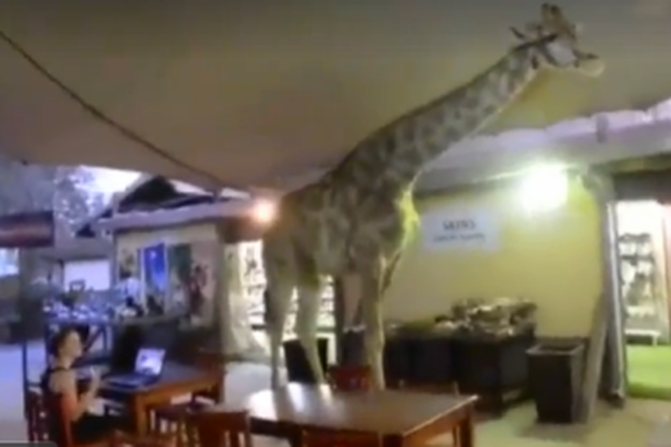 דרום אפריקה: הסועדים והעובדים הוכו תדהמה כשלמסעדה בה שהו נכנסה אורחת בלתי צפויה - ג'ירפה משוטטת, שככל הנראה איבדה את דרכה אל בור המים הקרוב.