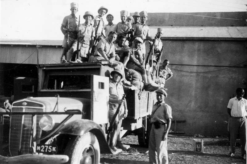 30. כשפרצה מלחמת העולם קראו ראשי היישוב לעזור לבריטים "כאילו לא היה ספר לבן" צעירים וצעירות נקראו לשרת בצבא הבריטי. מתנדבים מהארץ התגייסו לחיל התובלה, ההנדסה ונשים ל ATS ולחיל האויר הבריטי. הוקמה החטיבה היהודית הלוחמת בצבא הבריטי. בתצלום: עומד יהושע דיין חייל בצבא הבריטי בהולנד.