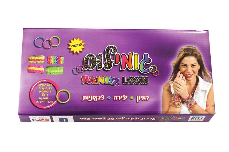 600 גומיות, סוגרים, נול, חמישה תליונים, מסרגה וחוברת הדרכה בעברית