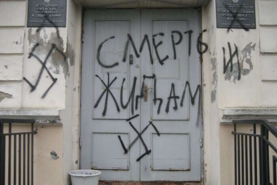הצד המכוער של המהפכה: מתפללי בית כנסת בסימפרופול שבחצי האי קרים, גילו הבוקר כי אלמונים ציירו צלבי קרס על קיר בית הכנסת, וכן "עיטרו" אותו בכתובת "מוות ליהודים".