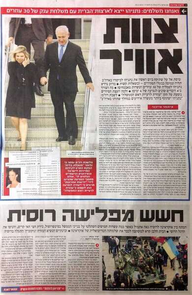 בעמוד הראשון של "ידיעות" - שום מילה על אותו אירוע זניח בחצי־האי קרים ובאוקראינה בכלל. אבל יש כמובן על המשלחת "המנופחת" של נתניהו לארה"ב. ואז, כשפותחים את העיתון, העמוד השני ברובו המכריע מוקדש לאותה משלחת "מנופחת", והחלק הארי של הפרויקט העיתונאי המופלא הזה מוקדש לגילוי שלשרה נתניהו יש עוזרת. כן, כן.
