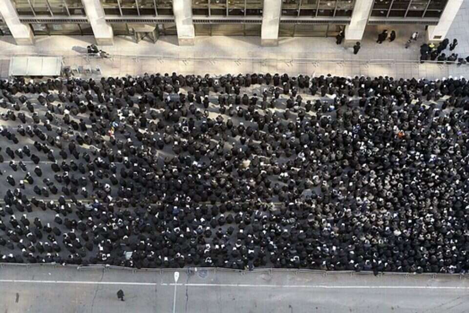 שבוע אחרי "הפגנת המיליון" של החרדים בירושלים כנגד מה שהם מכנים "גזירת הגיוס" לצה"ל, התכנסו אתמול אלפי חרדים בדרום מנהטן שבארה"ב, ליד המרכז הפיננסי וול סטריט.