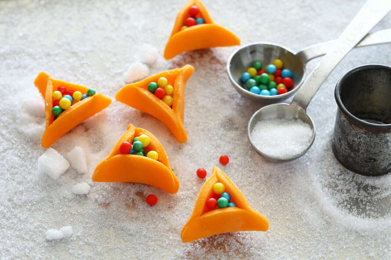 כך מתקפלים קישוטי אוזני המן מבצק סוכר כתום עז וסוכריות קטנות וצבעוניות, שאותם נטמין בתוך משלוחי המנות כהפתעה ססגונית ומשמחת. ממשיכה ומדביקה אוזניים, אף וחיוך על עוגיית קקאו פשוטה ופריכה והנה אוסף מסיכות דובים חמודים מתכנס בשמחה בתוך צנצנת הזכוכית.