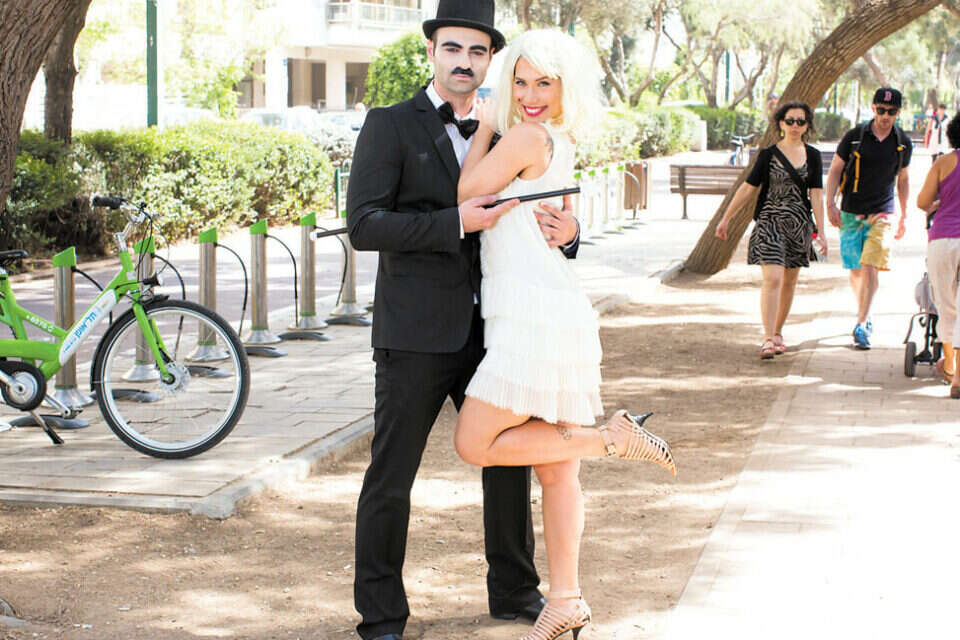 חולצה לבנה מכופתרת, מכנסיים שחורים ובלייזר שחור. האביזרים שנדרשנו לרכוש: מקל הליכה, כובע צילינדר שחור, פפיון וכפפות לבנות.