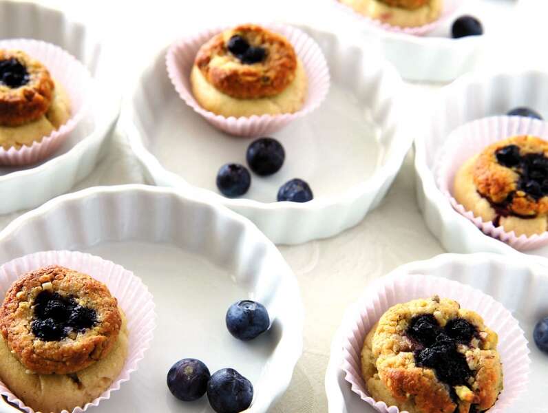 מכינים את המילוי: טוחנים את כל המרכיבים, למעט האוכמניות, לעיסה אחידה. מגלגלים עיגולים קטנים וממלאים את הגומה בבצק, כך שיישאר כדור קטן יותר מעל כדור הבצק. משבצים כמה אוכמניות מעל כל מילוי.