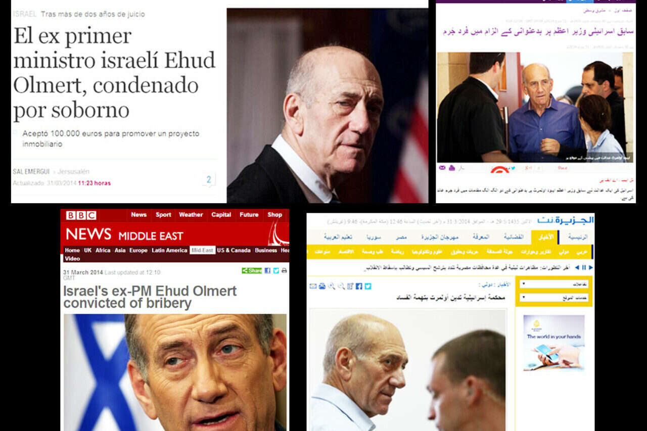 הדרמה הגדולה עם הרשעתו אתמול של ראש הממשלה לשעבר אהוד אולמרט היכתה גלים בכלי התקשורת ברחבי העולם. גם רשתות השידור הערביות לא ויתרו על ההזדמנות לסקר את תום חייו הפוליטיים של הבכיר הישראלי.