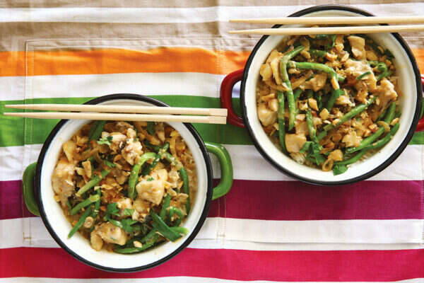 4. מוסיפים את השעועית הירוקה ואת הדג ומבשלים יחדיו על להבה נמוכה במשך כ־10 דקות.