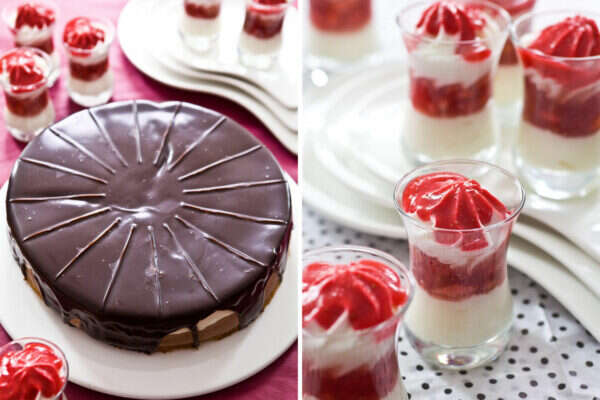מעבירים את מוס הווניל לשק זילוף ומזלפים את הקרם עד לחצי גובה הכוס. בעזרת כף מניחים מעט ממחית התותים. מזלפים עוד מוס עד לגובה שלושת רבעי הכוס. מקשטים ביתרת מחית התותים.